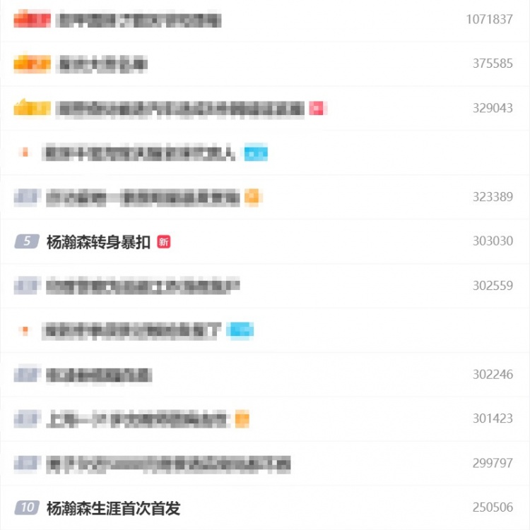 “杨瀚森转身暴扣”&“杨瀚森生涯首次首发”词条登微博热搜前10