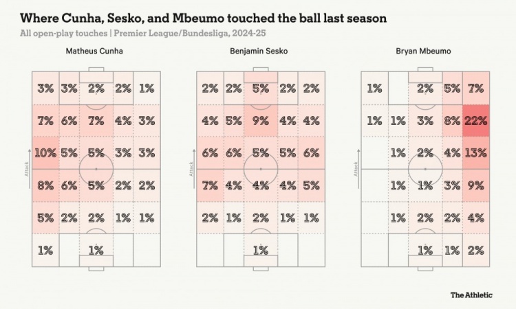 最基础的适配性要看位置:他们会互相挡路吗?阿莫林最终会排出什么阵型仍是未知数(塞斯科刚刚加盟,而姆贝莫和库尼亚也仅在对阵埃弗顿的季前赛里并肩作战了45分钟),但纸上谈兵的话,三人位置相当兼容。观察上赛季的触球热点图,你会发现:姆贝莫明显偏爱右路,库尼亚习惯从左路内切而非死抱边线,塞斯科则主要在中路活动。这意味着曼联完全可以让三人各司其职。