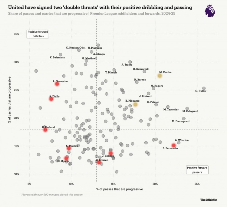 库尼亚和姆贝莫的技术特点近乎镜像,天然适配。两人都擅长用犀利直塞和强势推进带动球队——这正是曼联上赛季最缺的攻击属性(见下图)。库尼亚还有个关键加分项:他在狼队3-4-2-1体系里踢过左路10号位,而这正是阿莫林在曼联坚持的战术框架。