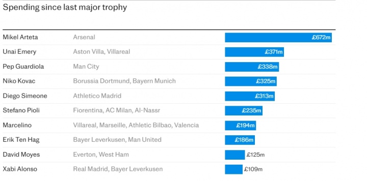 《电讯报》最新统计显示,自上次夺冠后各大主教练的累计引援投入中,阿尔特塔以绝对优势位居榜首,埃梅里、瓜迪奥拉、科瓦奇与西蒙尼紧随其后,滕哈赫则位列第八。